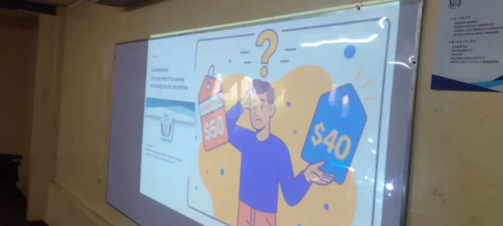 Con el objetivo de ampliar los conocimientos en el campo comercial de los emprendedores del barrio Campo Bruce y de sus estudiantes la Dirección de Extensión o Vinculación Social de la Universidad Técnica de Comercio (UTC) realizó el sábado 18 de octubre la capacitación titulada: “Errores más frecuentes que se cometen en la asignación de precios”. El expositor fue el Msc. Carlos Téllez Berrios, docente de la asignatura políticas y estrategia de precio.